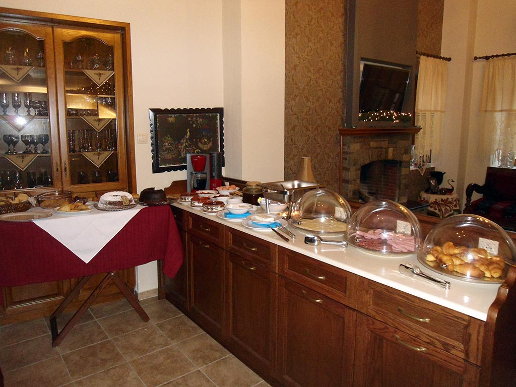 ξενοδοχείο ΦΙΛΟΞΕΝΙΑ σερβίρεται καθημερινά πλούσιο παραδοσιακό πρωινό σε μπουφέ: τυρόπιτα, ραβανί ,κέικ, πάστα φλώρα σταφιδόψωμο, ελιές (παραγωγής μας), γιαούρτι, φέτα και κασέρι , πάριζα, σαλάμι αέρος και καφές φίλτρου, ελληνικός, νες καφέ ,φρέσκο γάλα και τσάι του βουνού.