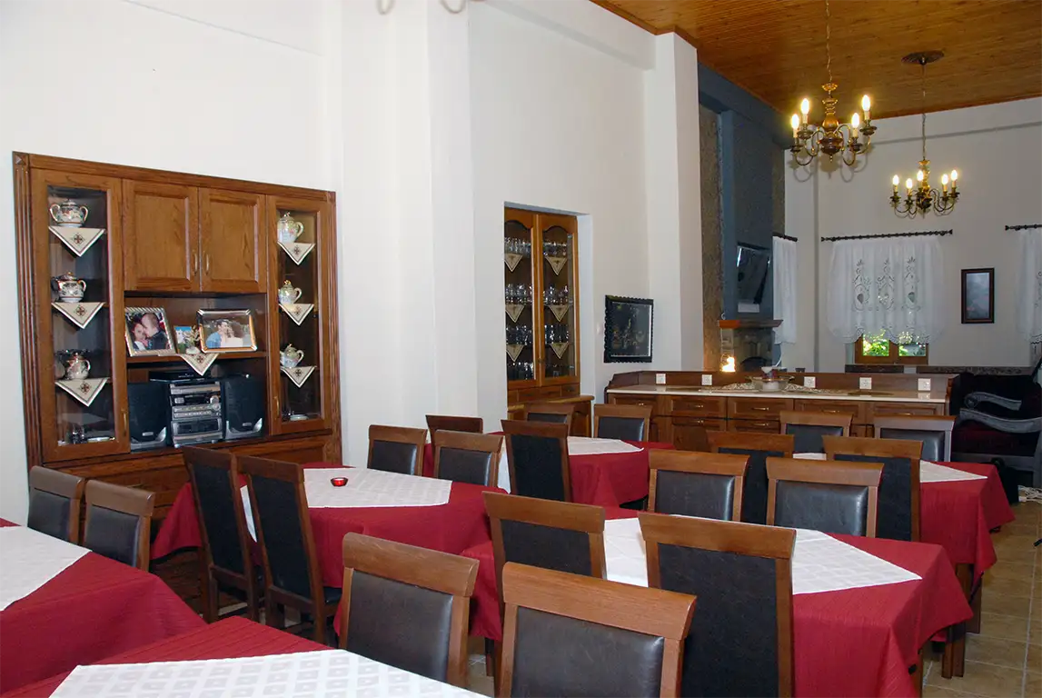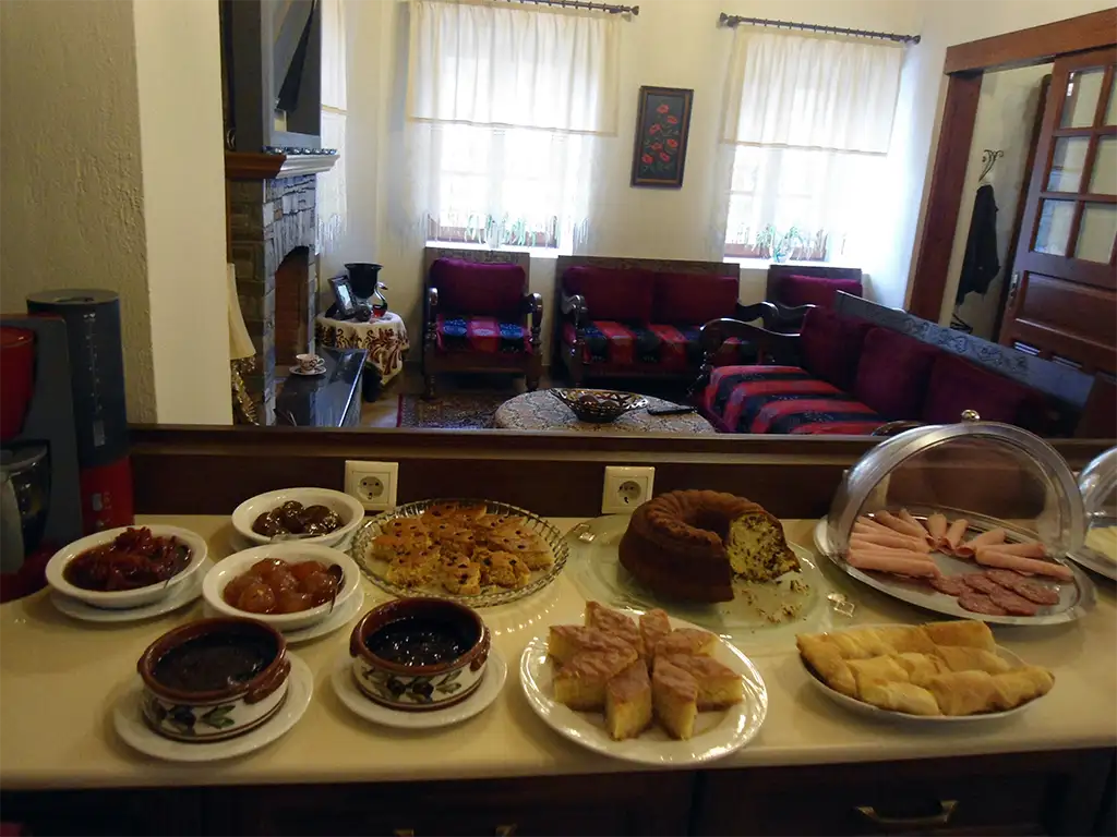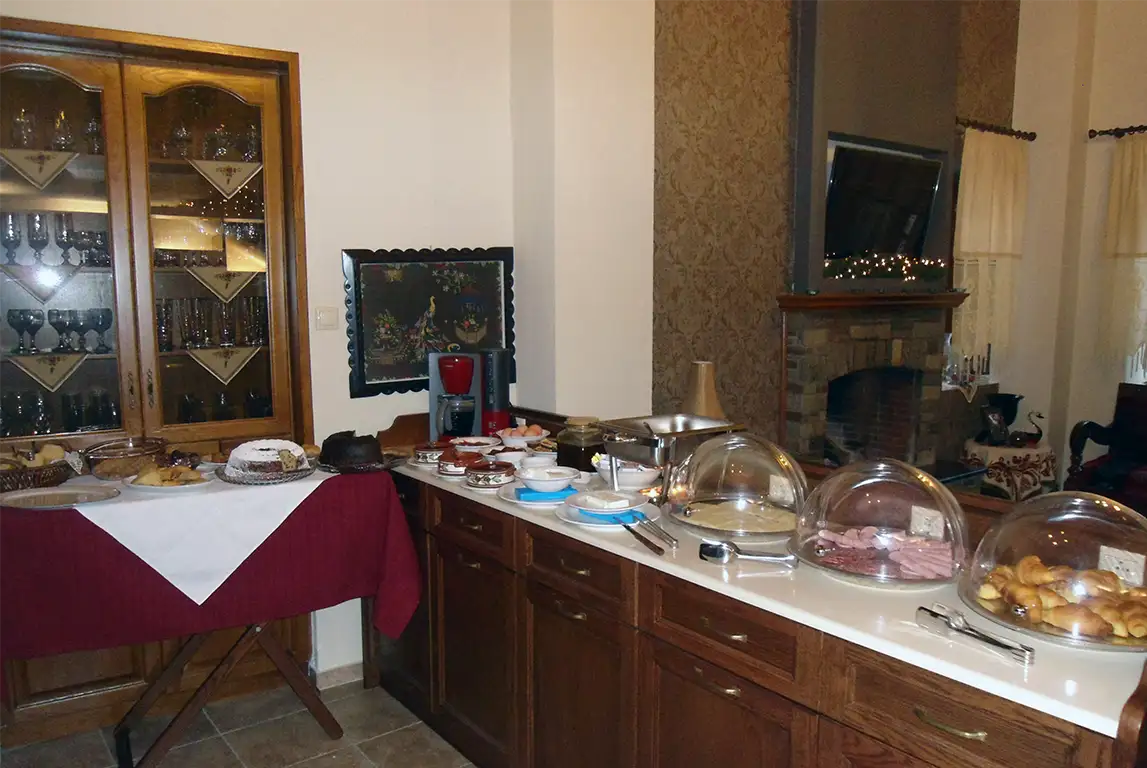 Προσφέρεται καθημερινά φρέσκο ψωμί, φρυγανιές, κριτσίνια, σπιτικά κουλουράκια, χυμός πορτοκαλιού, φρούτα εποχής , χειροποίητες μαρμελάδες (φράουλα, σύκο, μπερεκέτι, ροδάκινο, μυρτιλο κ.α), μέλι, σπιτικά γλυκά του κουταλιού (ιδίας παραγωγής μήλο φιρίκι – Πηλίου, σύκο, κυδώνι, νεράτζι, καρυδάκι κ.α), αβγά βραστά, αβγά τηγανιτά μάτια με λουκάνικα (τηγανισμένα σε ελαιόλαδο ιδίας παραγωγής), βούτυρο σε μερίδες, κορν- φλεηκς, κρουασάν βουτύρου, μερέντα σε μερίδες, τυρόψωμο,ελαιόψωμο, τυροπιτάκια ή τυρόπιτα, ραβανί, κέικ, πάστα φλώρα σταφιδόψωμο, ελιές (παραγωγής μας), γιαούρτι, φέτα και κασέρι , πάριζα, σαλάμι αέρος και καφές φίλτρου, ελληνικός, νες καφέ, φρέσκο γάλα και τσάι του βουνού.